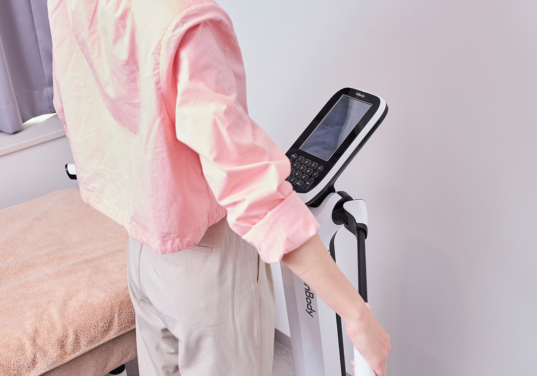 体組成計(インボディ)で脂肪量や筋肉量、体重、基礎代謝など体成分を詳しく測定します。