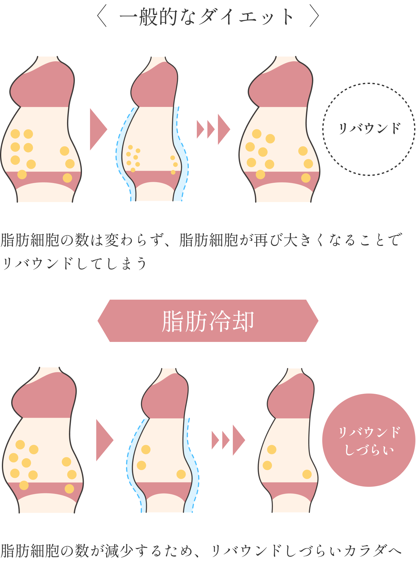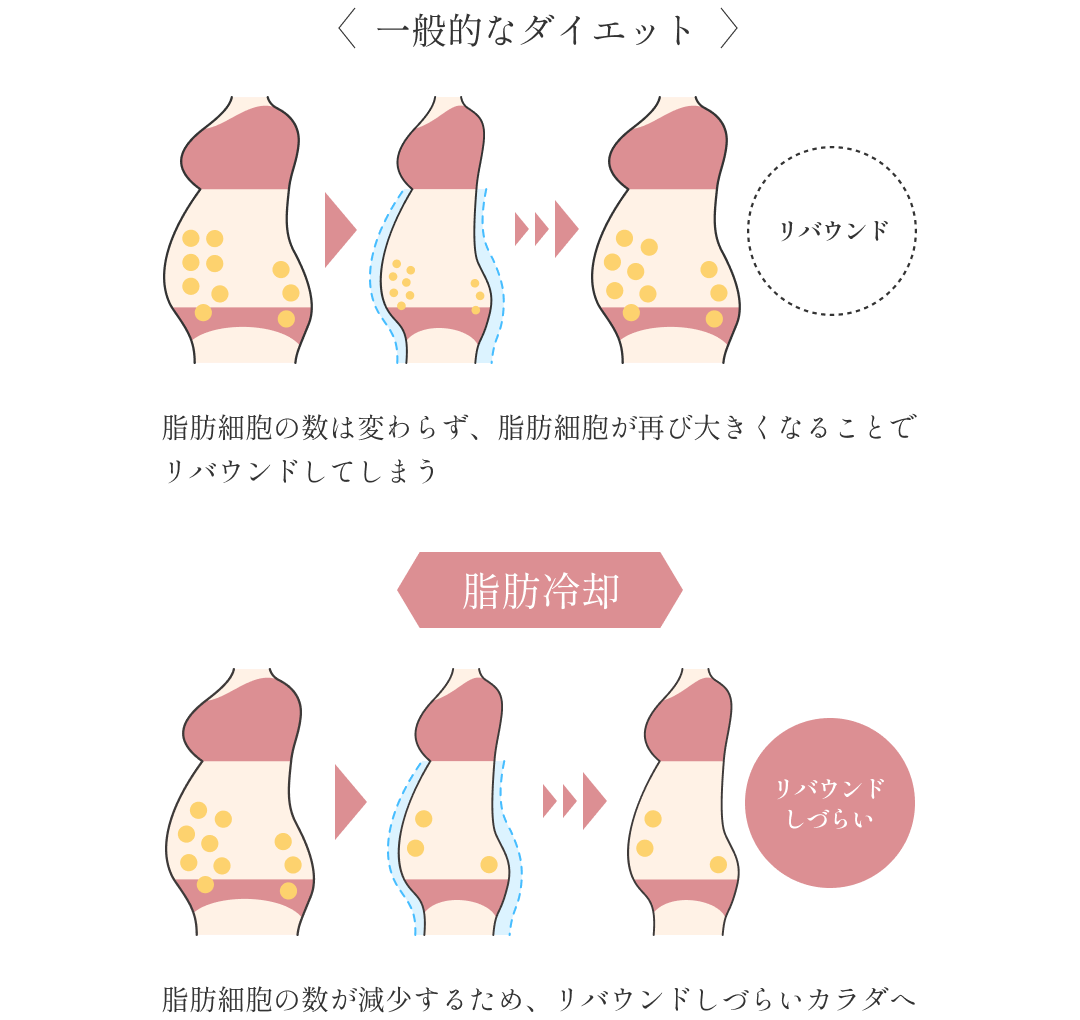 脂肪冷却は脂肪細胞のみを凍らせて破壊します。一度破壊された脂肪細胞は体外へ排出され、再生することはありません。脂肪細胞そのものが減少するので、リバウンドしにくい体質に変えることが可能です。